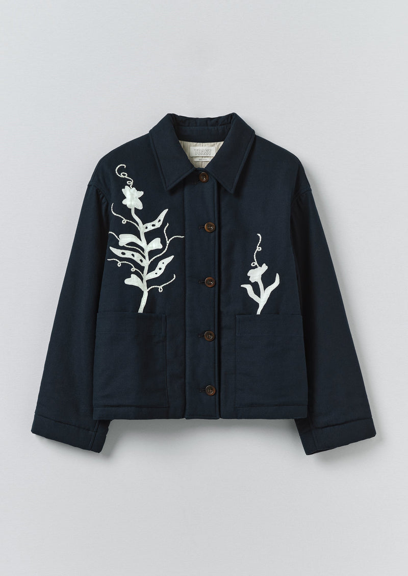 Pea shoot-appliqued organic cotton. Hand kantha-stitched. Collar. Wide placket. Front patch pockets. Buttoned cuffs. Lightly wadded. Striped organic cotton lining. Corozo buttons.