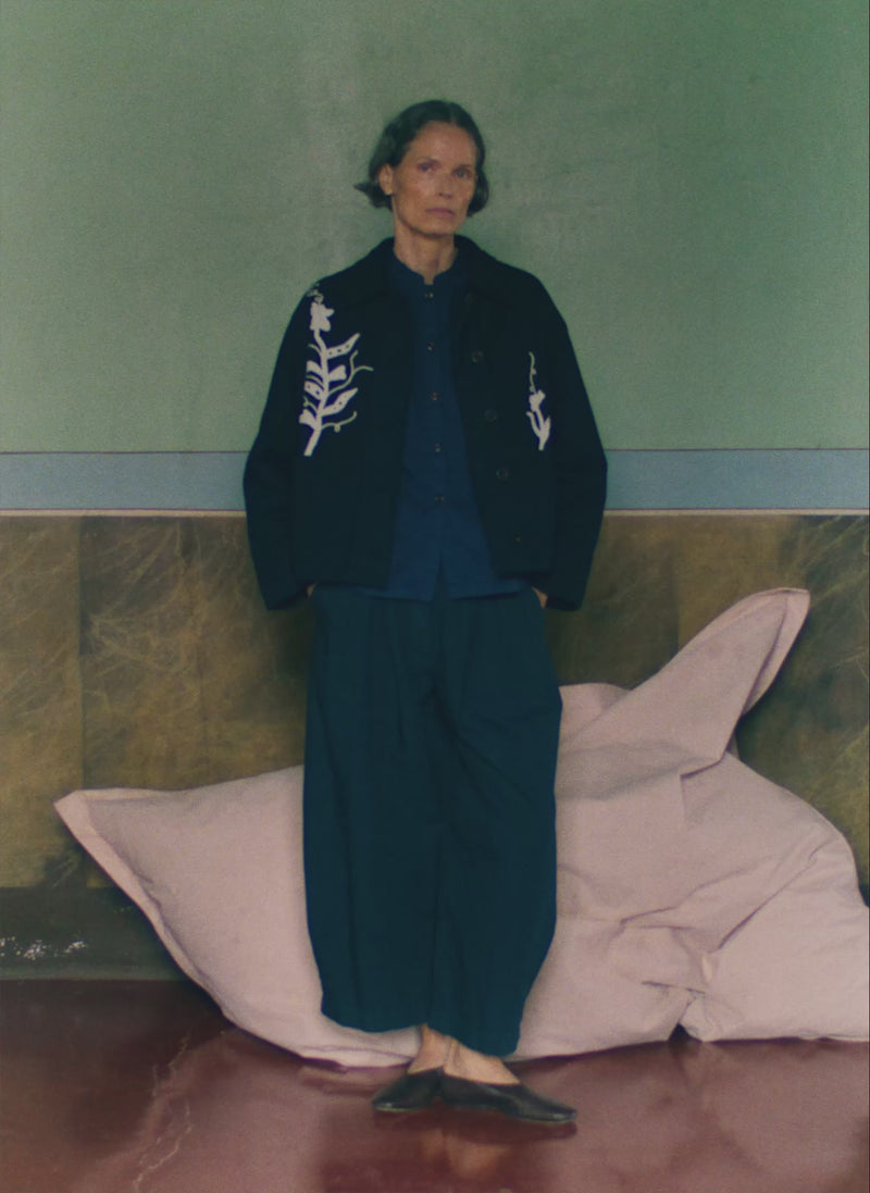 Characterful pea shoots wind up our jacket, carefully stitched by hand-guided machine in India and designed in collaboration with textile artist Madeleine Kemsley. Crafted from organic cotton to a boxy shape with a collar and punctuated by corozo buttons on the wide placket. Lightly wadded and kantha-stitched by hand.