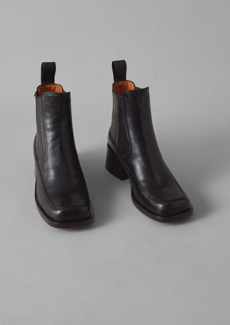 Western-inflected Lotte leather boots designed by TOAST and handcrafted by Chie Mihara in Spain. With a defined square toe and elasticated side panels, set on a block heel.