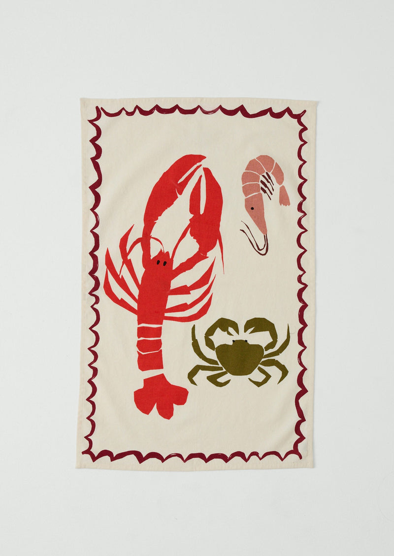 Tea towel hand screen-printed in India with a crustacean pattern and scalloped border. Made from cotton with neat hemmed edges and finished with a herringbone hanging loop.