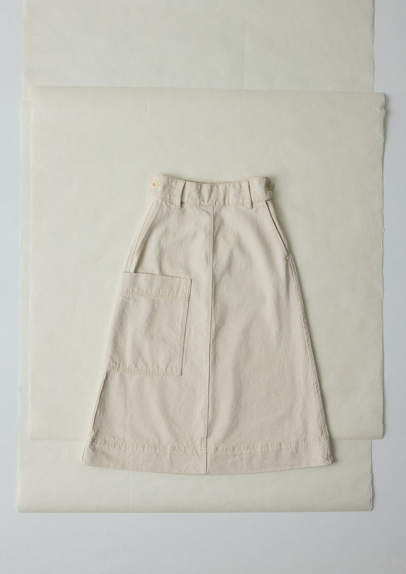 Our utilitarian skirt is accented by a buttoned tab at each side of the waist. Made from regenerative cotton denim to an A-line shape with a large side patch pocket. Our regenerative cotton is grown according to regenerative farming methods, restoring soil health, improving biodiversity, and reducing environmental impact.