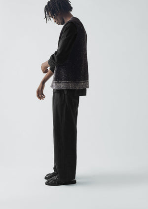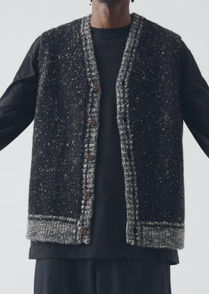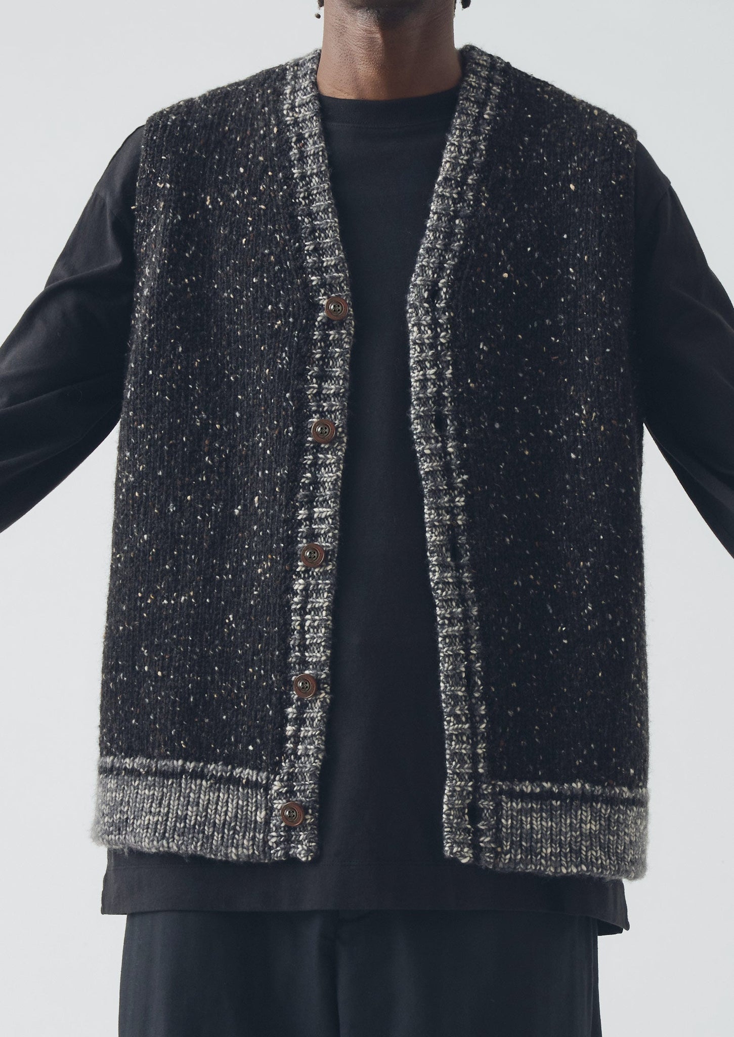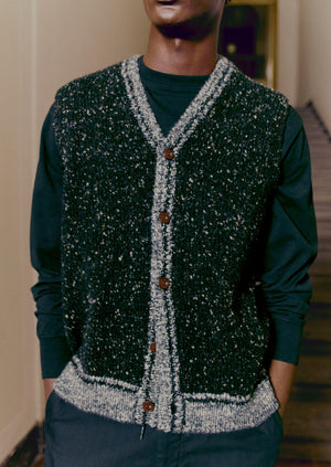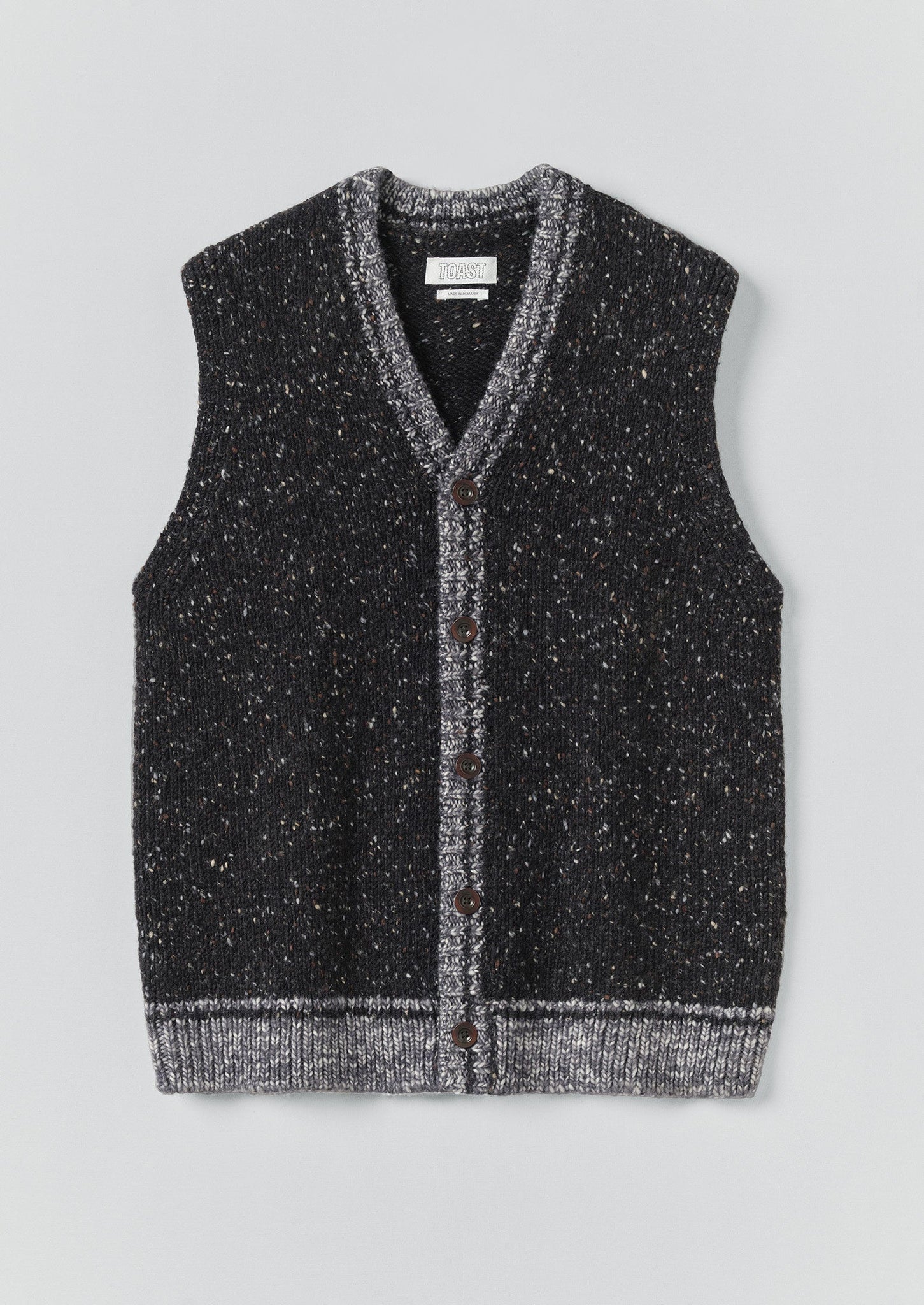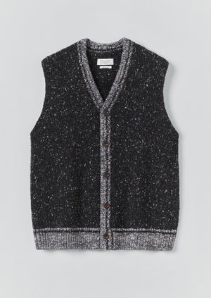 Button-through knitted tank made from flecked Donegal yarn. Shaped with a V-neckline and finished with contrasting ribbed trims. Part of our Menswear collection.
