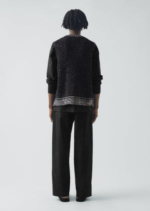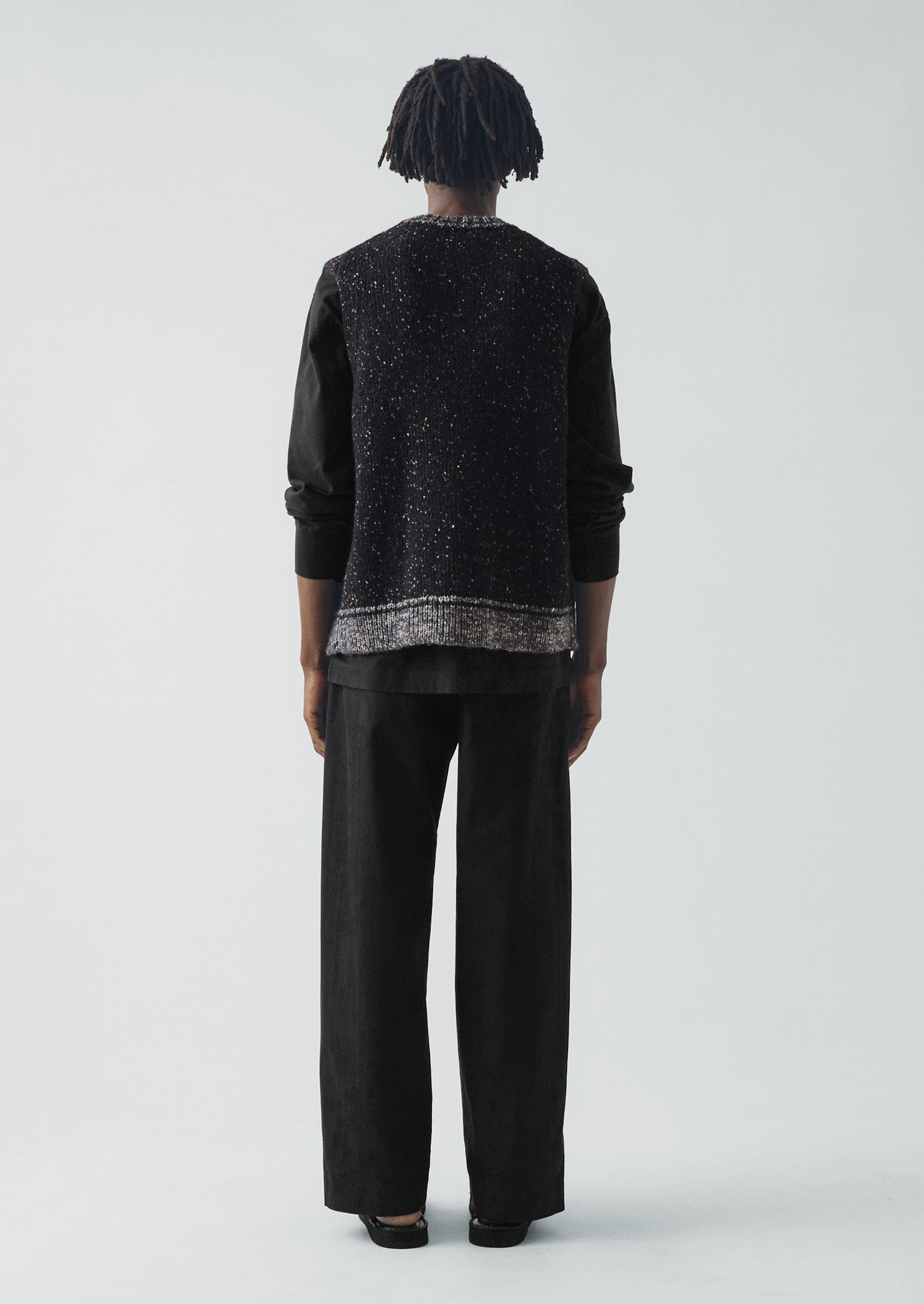 Donegal-spun wool. V-neck. Contrasting ribbed trims. Corozo buttons.