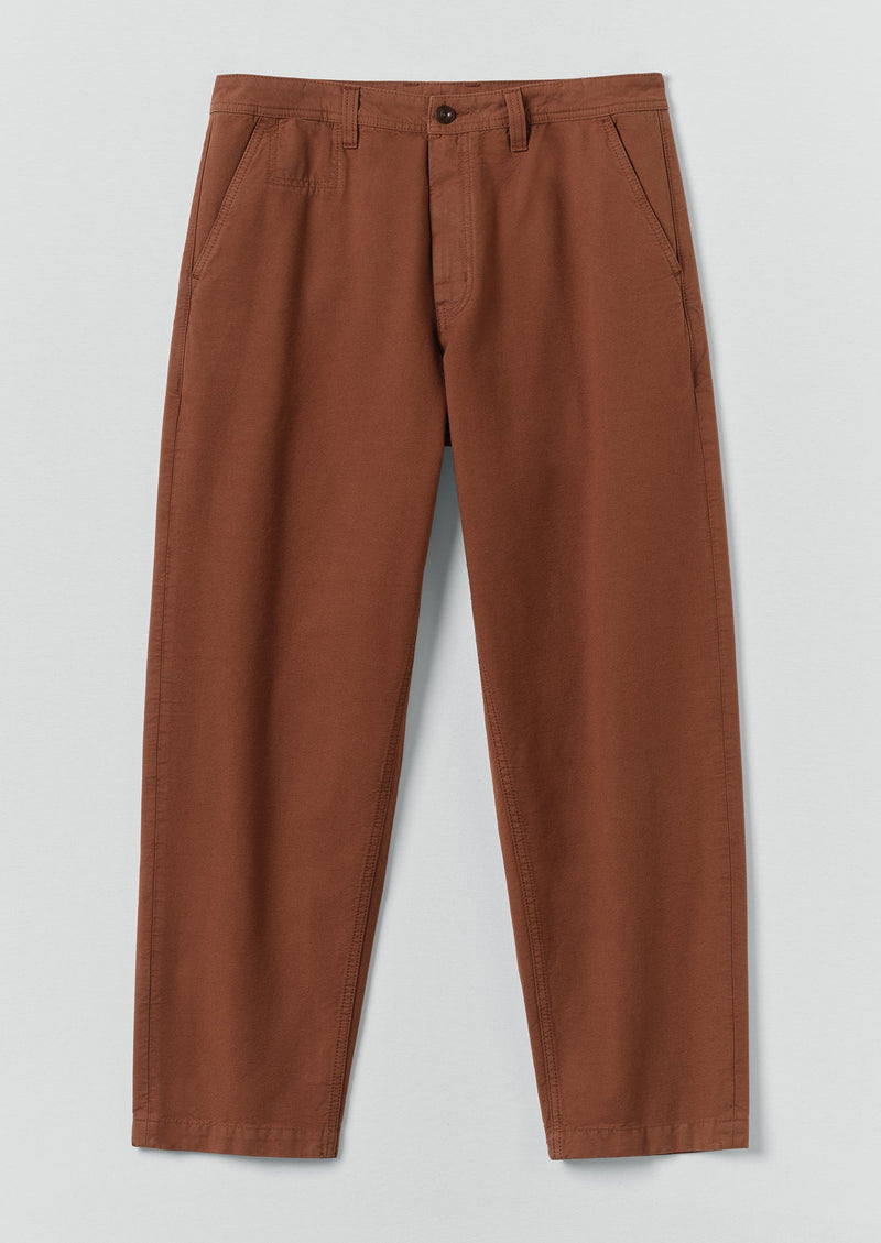 Cotton canvas. Garment-dyed. Relaxed fit. Tapered leg. Slant side pockets. Belt loops. Corozo button and zip.