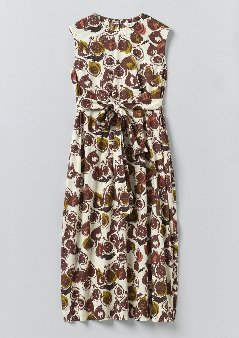 A painterly fig print illustrates our organic cotton poplin dress. Cut to a rounded shape which is defined by the waist tie, falling to a lower-calf length.