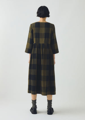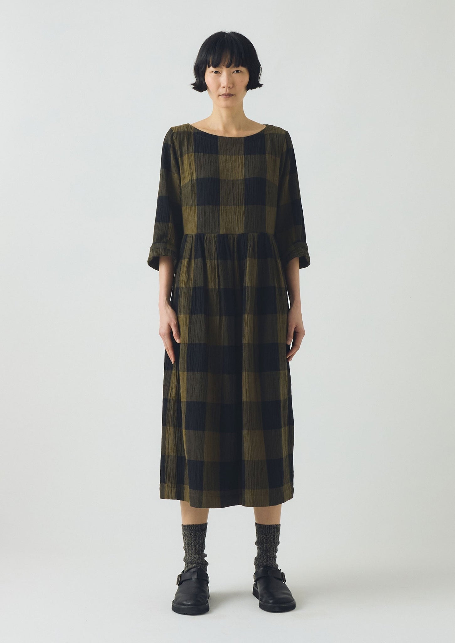 Our macro gingham dress is made from double-faced crinkle cotton. With a light texture, gathers below the waist create fluid movement. Three-quarter-length sleeves can be folded shorter or worn as they are.