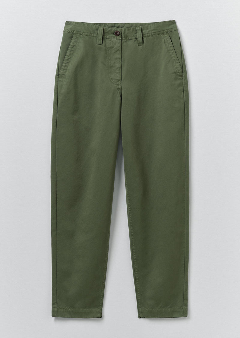 Organic cotton twill. Garment-dyed. Topstitching. Below waist. Belt loops. Side pockets. Coin pocket. Back welt pockets. Ankle-skimming legs. Zip and corozo button.
