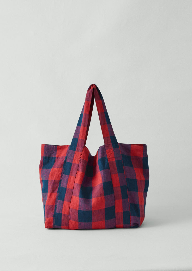Lightweight linen. Wide gingham check. Two handles. Internal pocket. Cotton cambric lining. Herringbone hanging loop.
