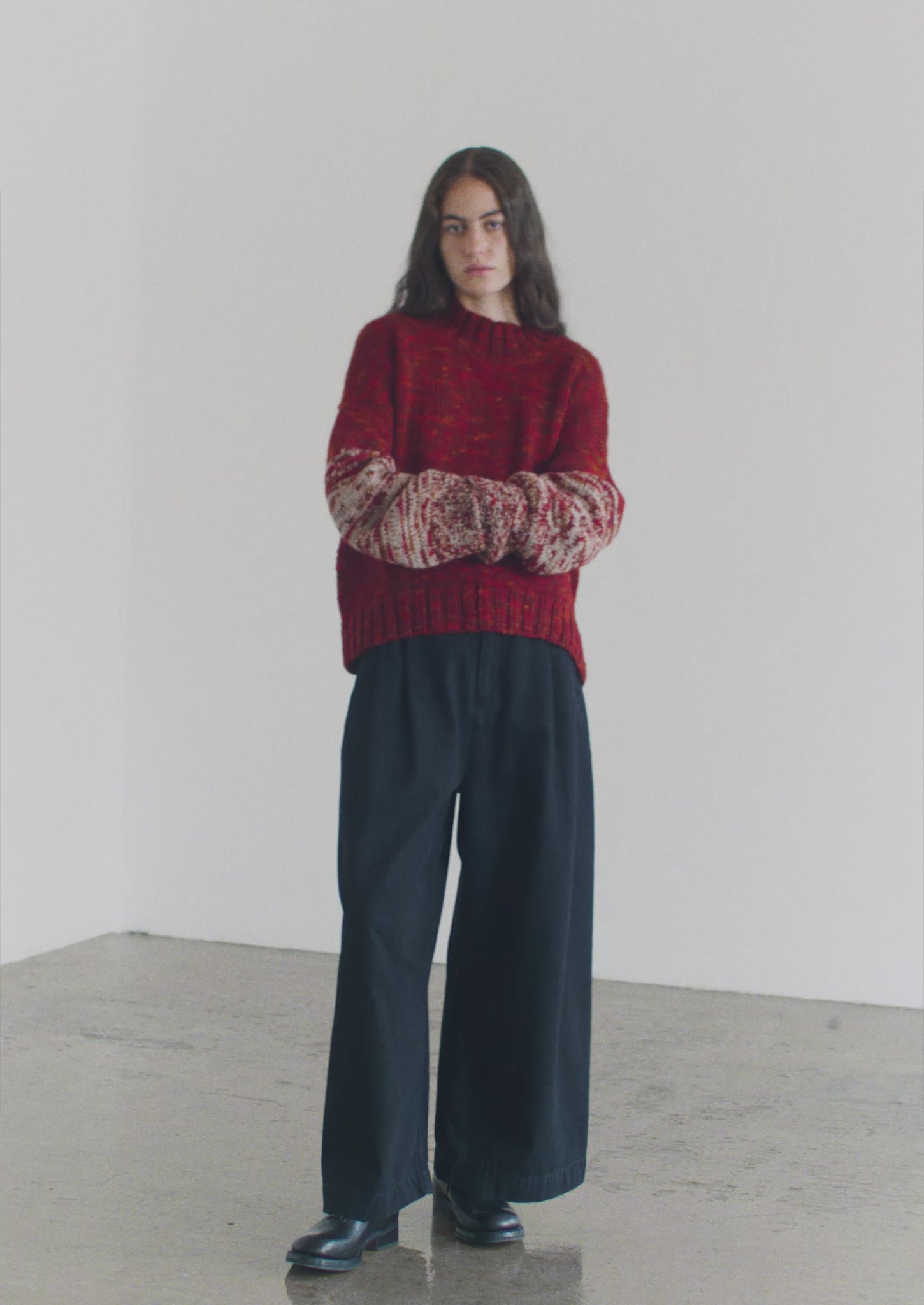 Our high neck wool sweater is made from hand-dyed yarns. Natural variations in tone make each piece unique. Shaped to a straight, boxy fit with long, contrasting sleeves, a subtle mock neck and wide ribbed edges. Knitted with local wool and hand-framed by artisans supported by Manos del Uruguay, a non-profit founded in 1968 to empower women in rural Uruguay.