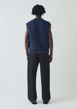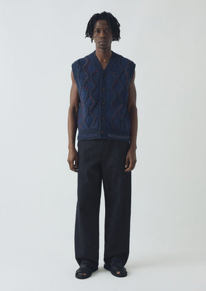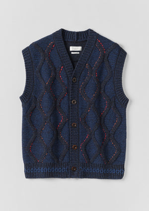 Our button through tank is hand-embellished, tracing the cable design with vibrant stitching. Shaped with a V-neckline and finished with ribbed edges, the tank fastens with corozo buttons. Argyle detailing runs across the hem. Part of our Menswear collection.
