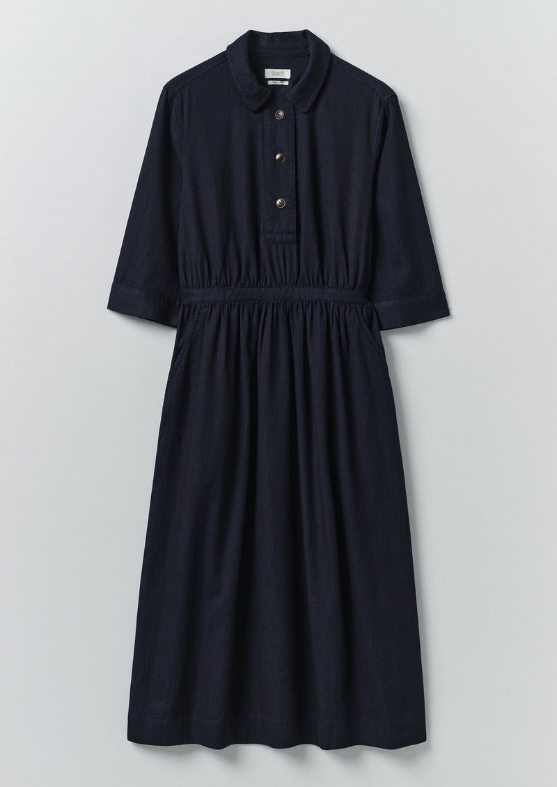 Indigo organic cotton twill lends depth of tone to our shirt dress. Cut to an easy silhouette with a half placket and elasticated waist, then finished with side pockets.