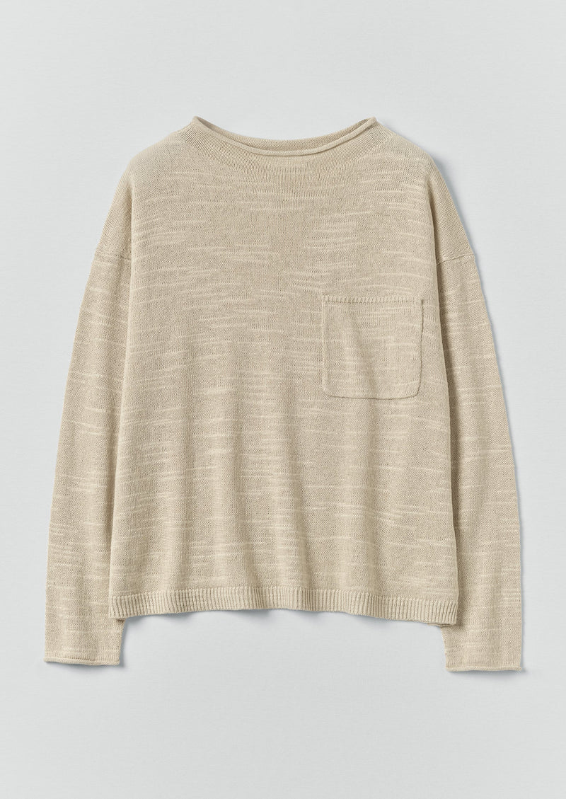 Our fine knit sweater is made from a linen and cotton-blend yarn with a slubby texture. Shaped with dropped sleeves and punctuated by a chest patch pocket.