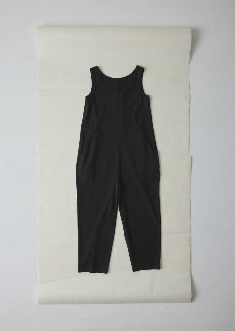 Compact organic cotton jersey. Garment-dyed. Boat neckline. Scoop back. Side pockets. Back patch pockets. Wide ankle-skimming legs. Back corozo buttons.