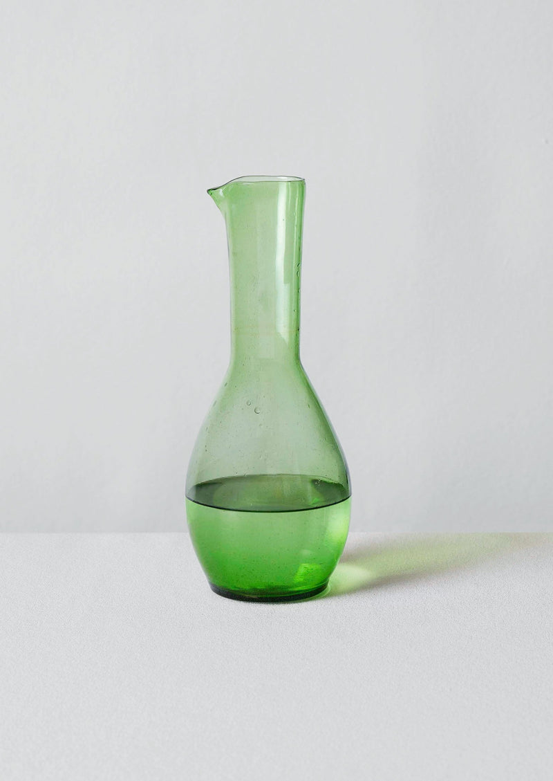 Glass carafe hand-blown from recycled glass at the Beldi Country Club in Marrakesh. The group of 60 artisans are from the last glass factory in Morocco. They recycle two tons of glass a day with any waste from the process melted down again. Shaped with a lipped rim, tapered neck and rounded base with thick walls, slight warps, marks and air bubbles, which are traces of the artisanal process.