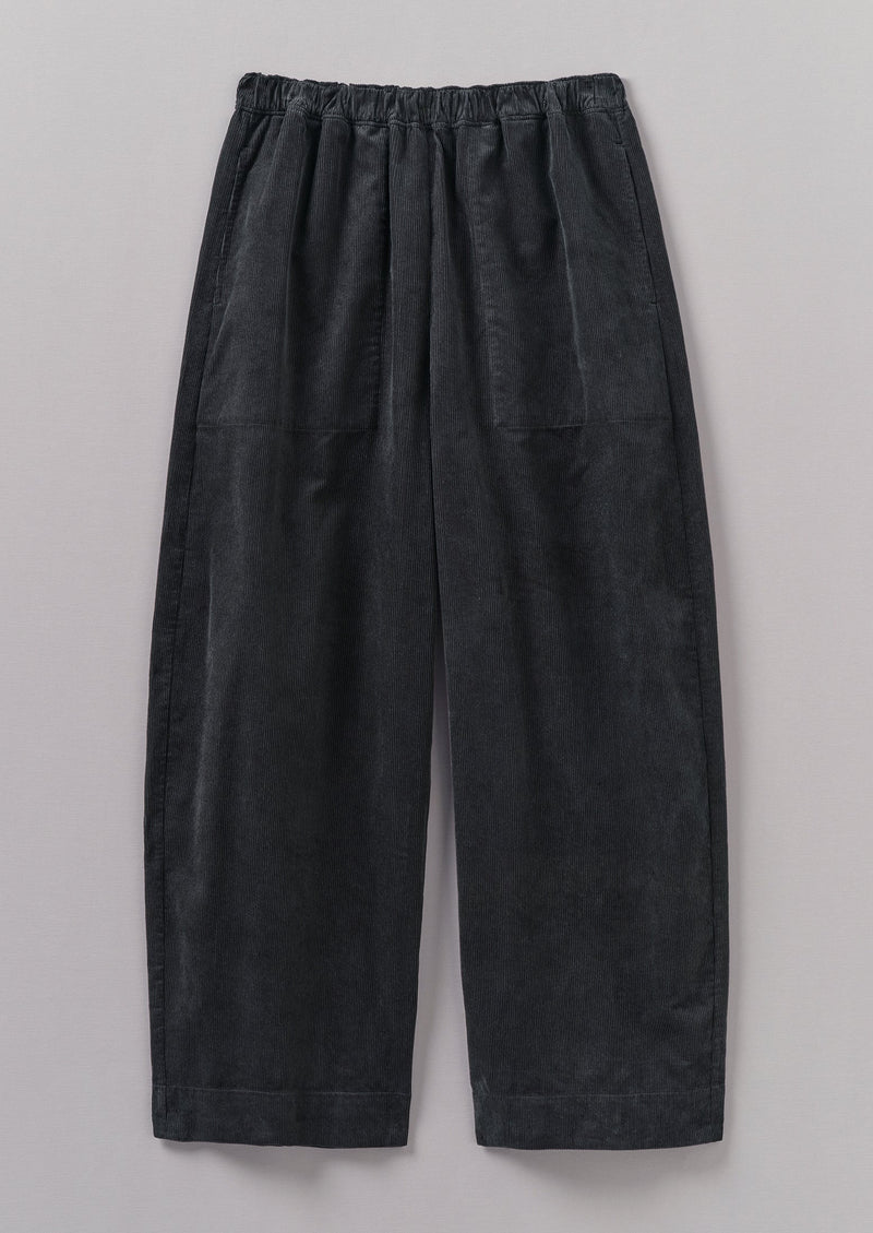 Soft organic cotton cord lends a suppleness to our pull-on pants. Falling from an elasticated waist to curved barrel legs and finished with topstitching.