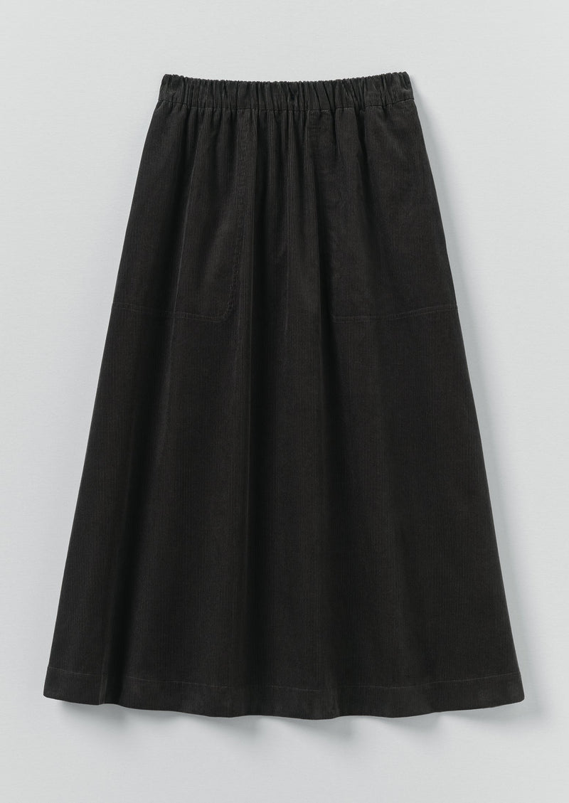 Soft organic 13-wale cord brings ease to our skirt. Falls from the elasticated waist to the lower calf and finished with a back patch pocket.