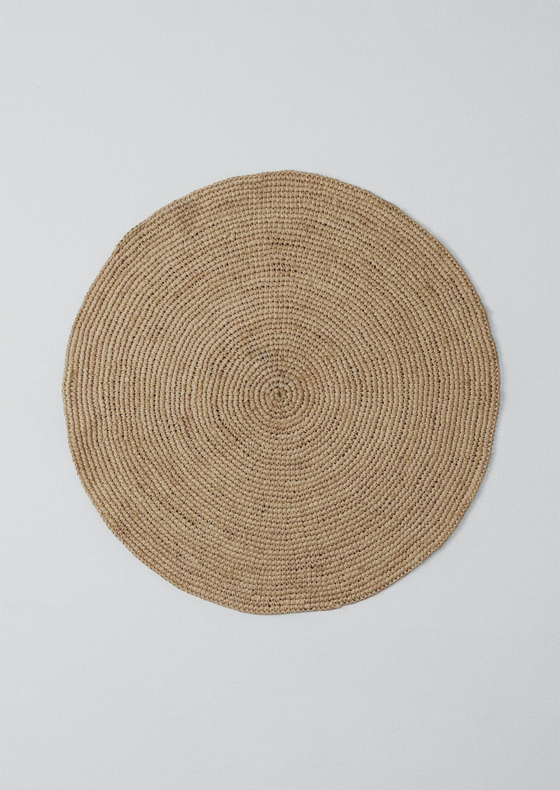 Hand crocheted raffia placemat - lightweight and flexible. Each individual mat is made in Madagascar from the natural fibres of the native raffia tree. The naturally strong raffia fibres are favoured for their soft, flexible and biodegradable qualities.