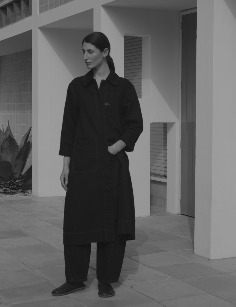 Our barrel-leg pantsare made by stitching panels of organic Japanese Kuroki denim, creating a twisted silhouette. Founded in Ibara, Okayama in 1950, Kuroki Mills is one of only a few denim producers with integrated dyeing, weaving and finishing facilities. With a high waist, a metal shank button at the fly, and two back pockets.