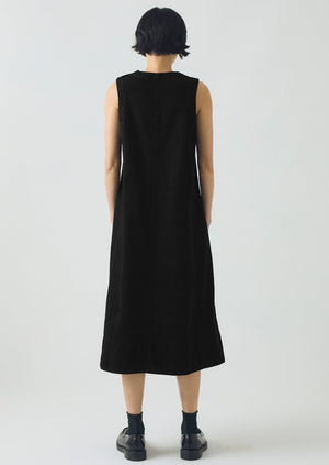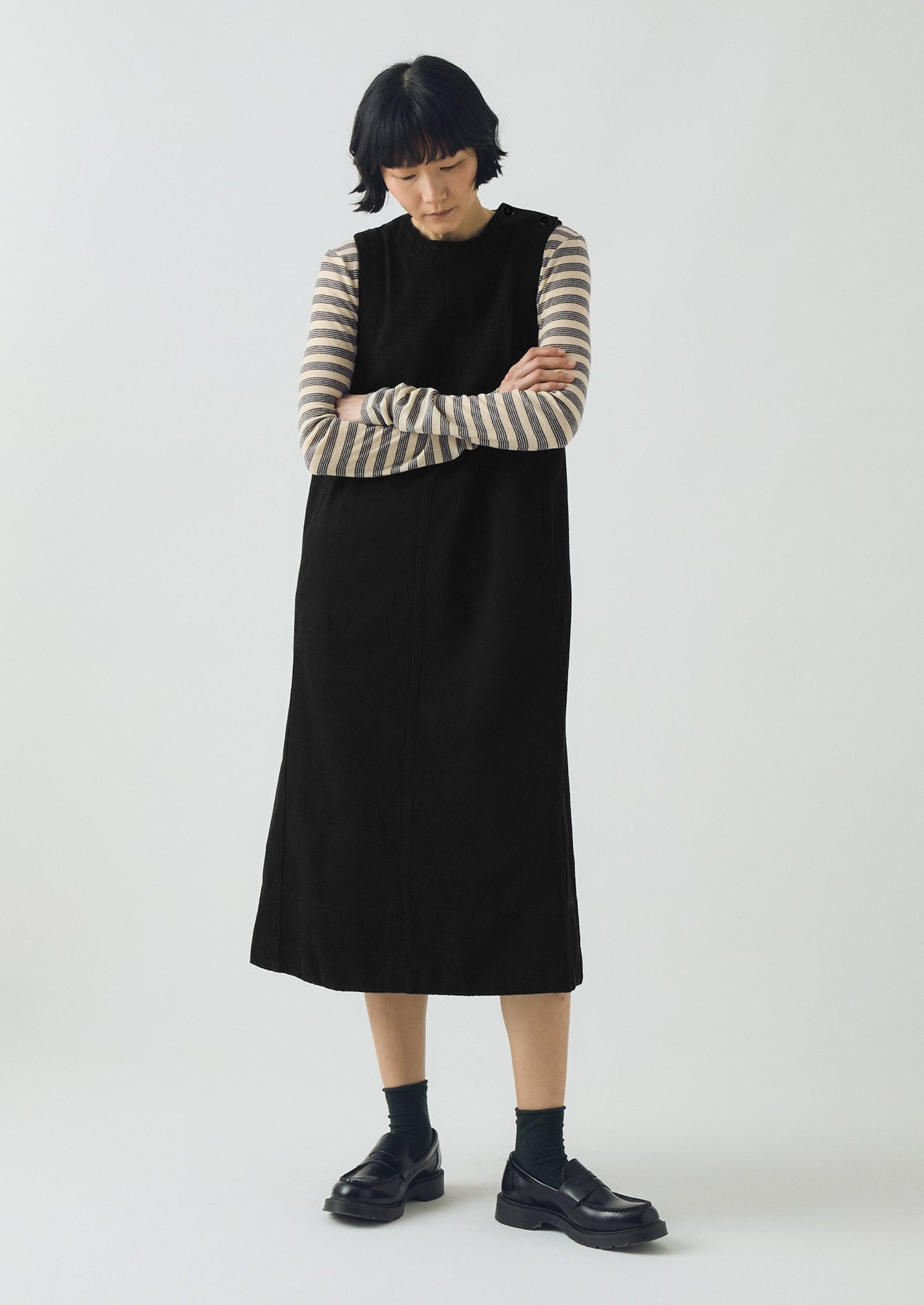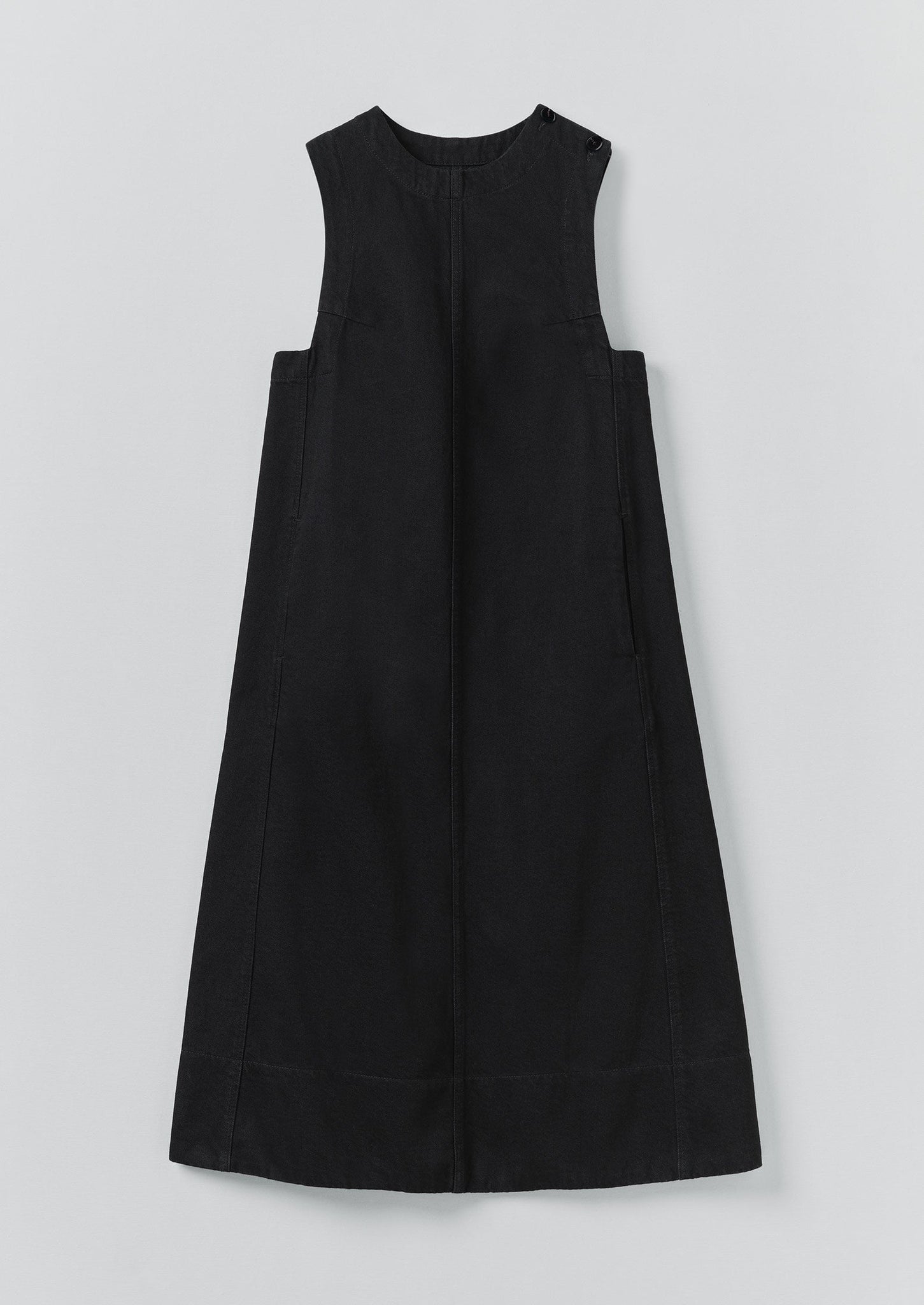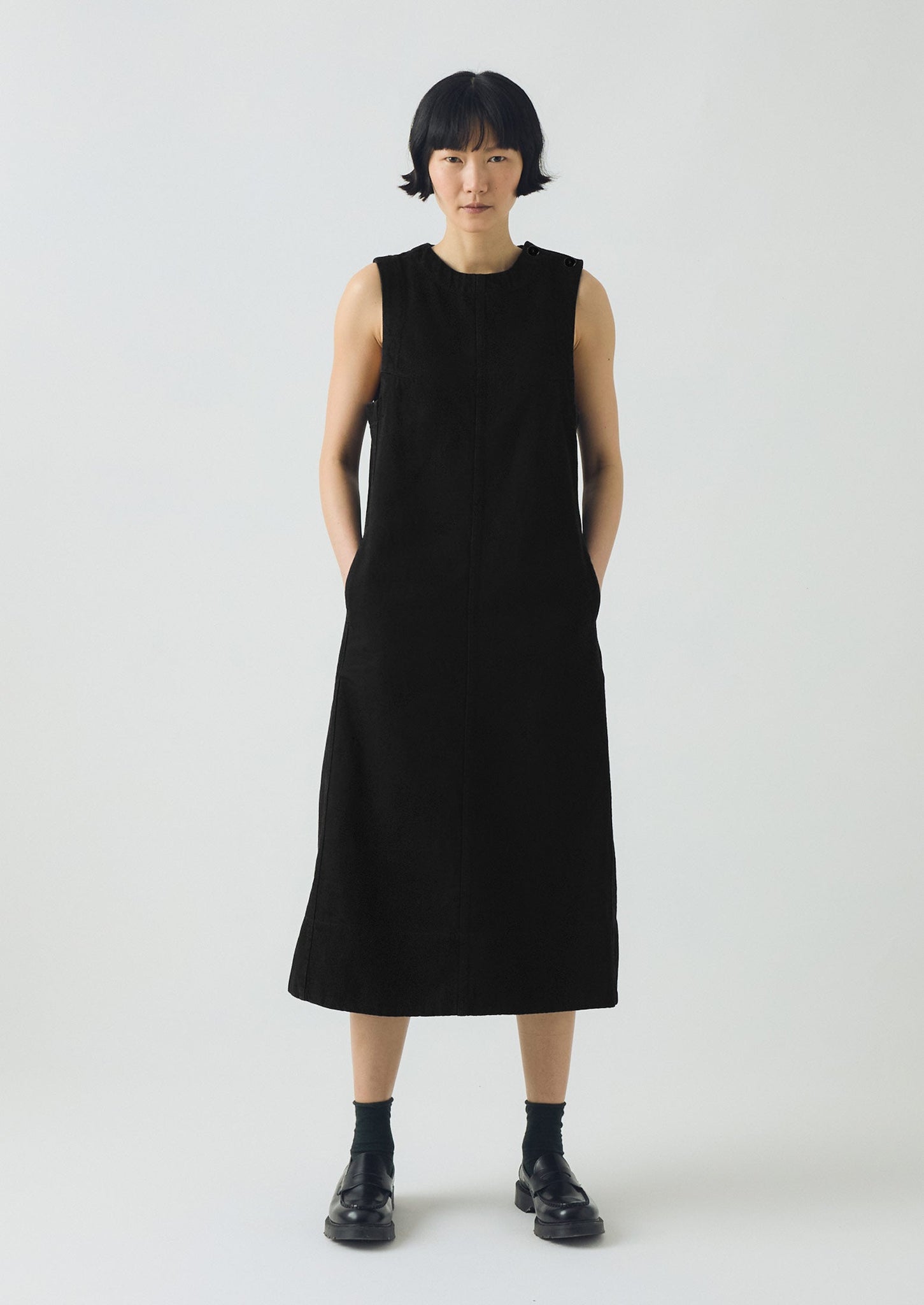 Denim workwear dress made from a blend of regenerative and recycled cotton. Straight, slim silhouette. With in-seam pockets and a horn button fastening at the side shoulder. Falls to the lower calf with a rounded neckline.