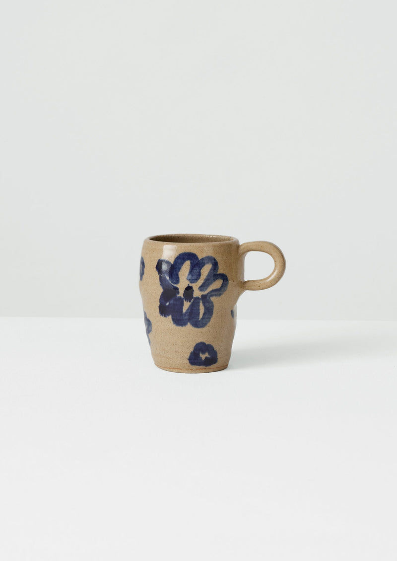 Hand-thrown tall mug by Sophie Fletcher of Zosia Ceramics, crafted in Cambridge. With a high handle and patterned with expressive cobalt and oxide flowers, each piece is a unique reflection of fluid, painterly gestures.